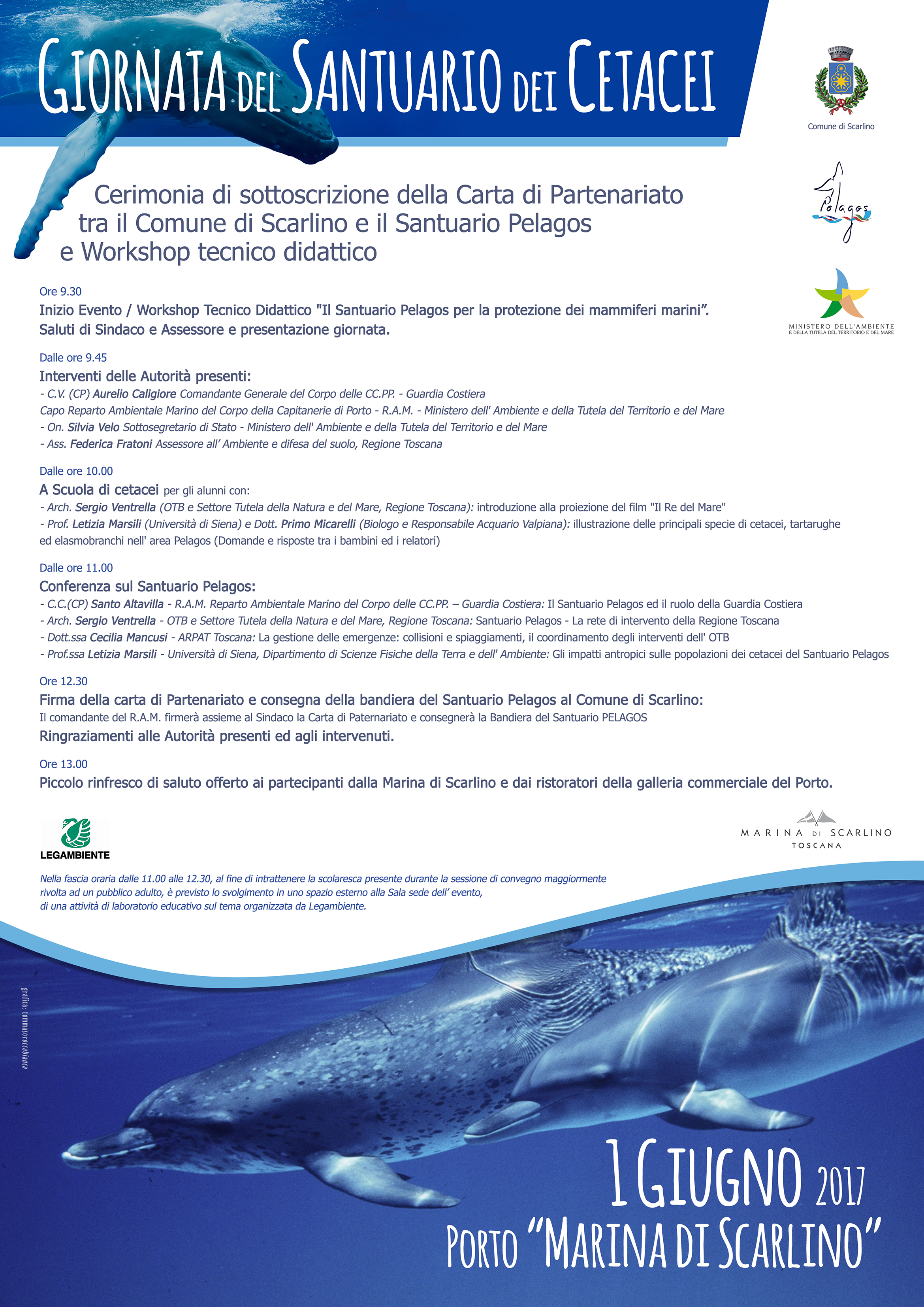 Il 1 giugno 2017 si è tenuta alla Marina di Scarlino, dopo una mattinata di workshop e laboratori didattici dedicati ai mammiferi marini, la cerimonia di sottoscrizione da parte del Sindaco Marcello Stella della carta di partenariato Pelagos.